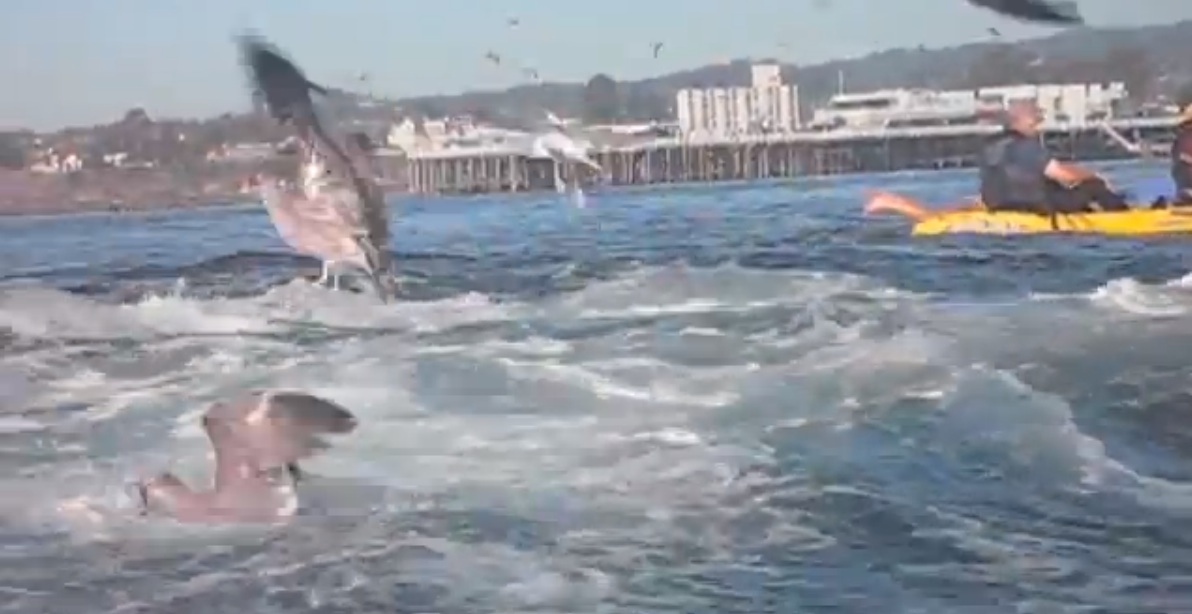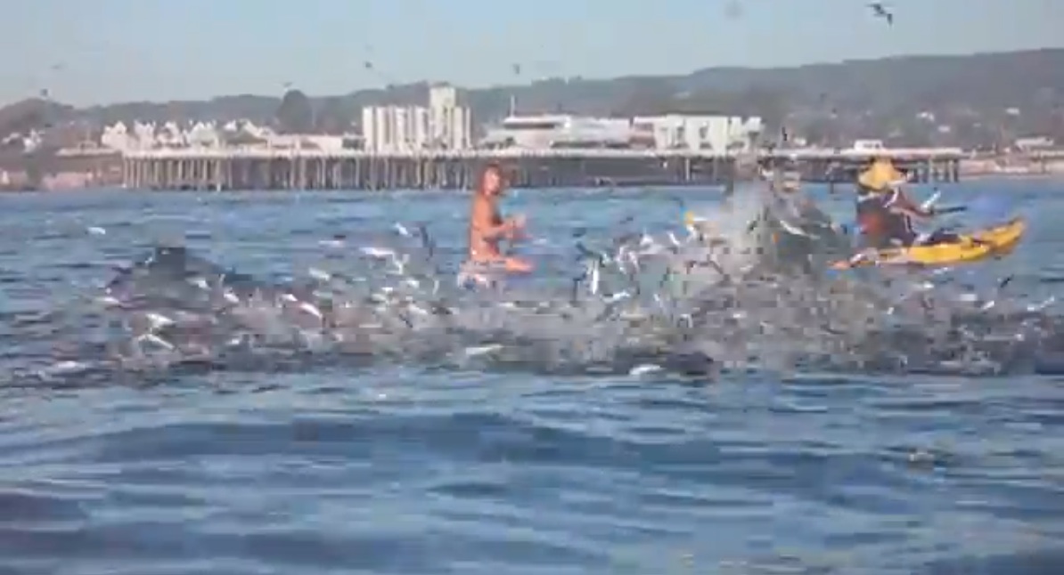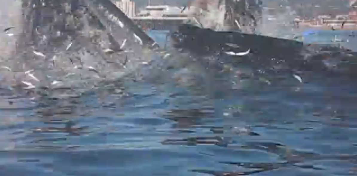 In the video, when the whales breach, stop the video and go frame by frame. You’ll see thousands of terrified anchoves jumping in the second or so before the whales appear. You have to imagine these two huge beasts swimming fast deep below the surface, driving up, chasing the bait ball of anchovies until they have them pinned against the surface, then driving up and through the trapped fish with their huge mouths wide open. Pretty cool.