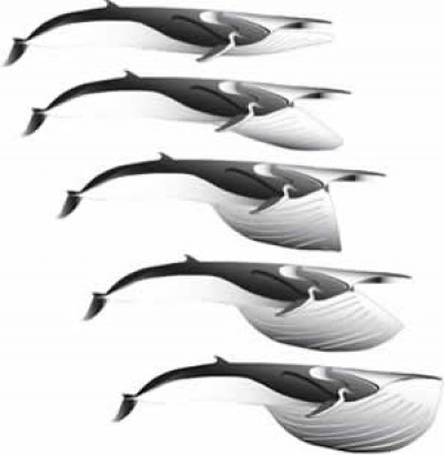 I’ve been interested in whales and dolphins since I was a kid, but until now I’d never seen a video that actually depicted a baleen whale gulping down food. As most everybody who pays any attention to this sort of thing knows, pretty much all of the big whales except the sperm whale are baleen feeders, meaning they have a huge filtering system which allows them to take in massive amounts of water and small fish, then filter out the water and keep the fish. I’ve heard this explained in textbooks, on documentaries, etc — but had never actually seen it up close until this video. Here is a diagram showing how it works:
