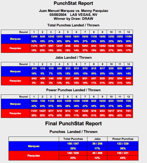 As the November 12 trilogy bout between Manny Pacquiao and Juan Manuel Marquez draws closer, it’s only natural to think about their previous fights and want to revisit them — after all, only 1 point separates them on the judge’s scorecards after 24 rounds of epic boxing. A number of boxing journalists and bloggers have done just that, so I’m cautious about what I can hope to add to the discussion. But the rehashes I’ve read have left me still wanting something that analyzes a bit more deeply what happened on the judge’s scorecards, and how did that square with what Compubox tells us, and what the ringside commentators–especially hall of fame trainer Emmanuel Steward and Larry Merchant–and the two trainers saw while the fight was happening.