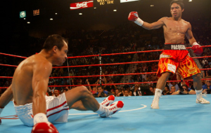 Before Lampley can finish what he’s saying, Pacquiao–not happy, obviously, by being rocked back into the ropes– charges forward and BOOM — he floors Marquez with a shuddering left.