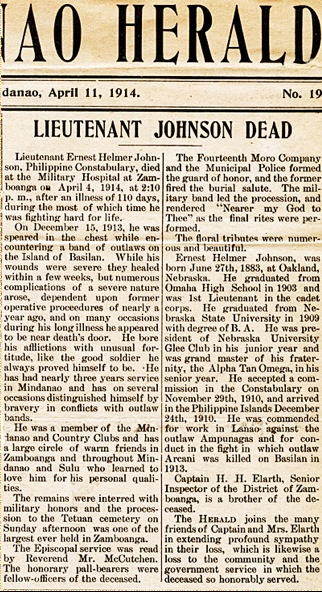 Lieutenant Ernest Helmer Johnson, Philippine Constabulary, died at the MilitaryHospital at Zamboanga on April 34, 1914, after an illness of 110 days, during the most of which time he was fighting hard for his life.