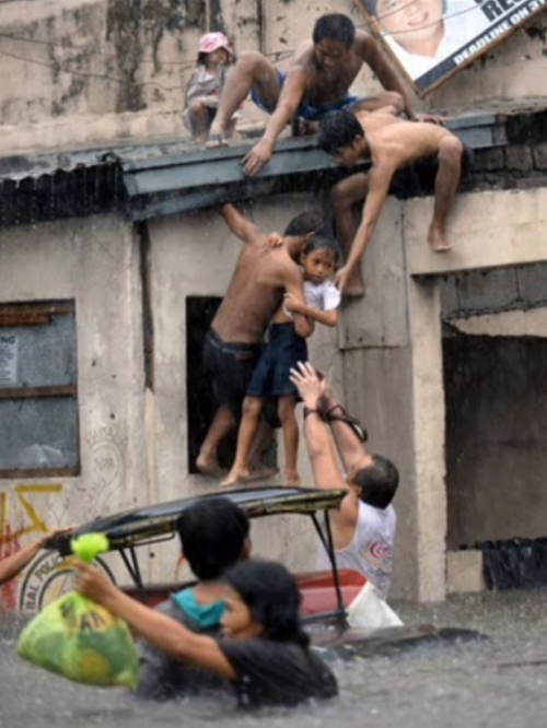 I was watching some youtube videos and came across a picture from the Philippines showing some kids hoisting another kid out of a tricyle trapped in typhoon flooding. I had never seen this particular picture before — but I found myself really feeling like it captures, very dramatically, a spirit of “bayanihan” that is distinctly Filipino. And after looking at this, I did an online search and found so more images on the subject of the Bayanihan Spirit — they’re below as well.