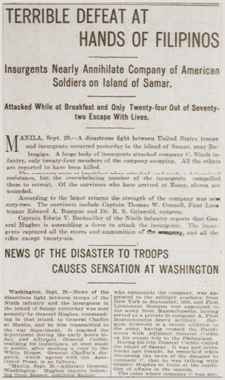 Six weeks later, on September 28, 1901, the townspeople in coordination with the rebels rose up and killed 48 of the 74 Americans. Here is how the New York Times covered the story: