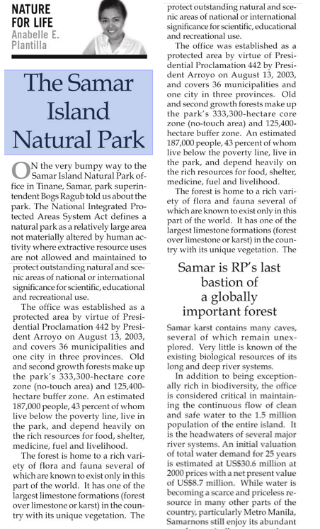 Here is the best article I have been able to find on the Samari Island Natural Park — unfortunately it only seems to exist in a Google News Reader scan of the physical Manila times