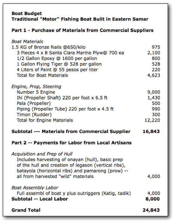 The counterargument goes as follows. Although the price is P25,000 for each, the locally built native boat includes, within the cost of P25,000, about P8,000 that will go to local artisan boat builders for their labor contribution to the boat that is created. Here is a breakdown of the budget for a boat, dividing it into supplies purchased from stores/commercial outlets (currently in Catbalogan, which is a little bit outside of the main affected area, but soon perhaps these purchases could be made in Guiuan, which is within the affected area and thus the purchases in Guiuan stores would directly benefit the affected region)