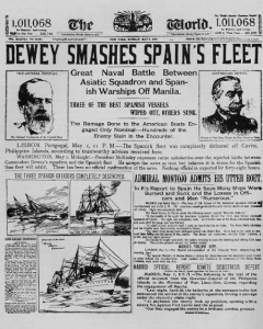 America went to war with Spain and fought the war on two fronts — in Cuba, and in the Philippines. Commodore (soon to be Admiral) James Dewey and the American Asiatic Squadron defeated the Spanish Fleet in the Battle of Manila Bay, and at the successful conclusion of the brief war America gave Cuba its freedom, but took the Philippines as a colony. Philippine insurrectionists who had made common cause with America against Spain objected but to no avail. In February 1899 war broke out between the US and the Phililppines — a war that started as a conventional affair, and quickly devolved into a Vietnam-style insurgency. In 1901 the US declared military victory and began a period of civilian rule.